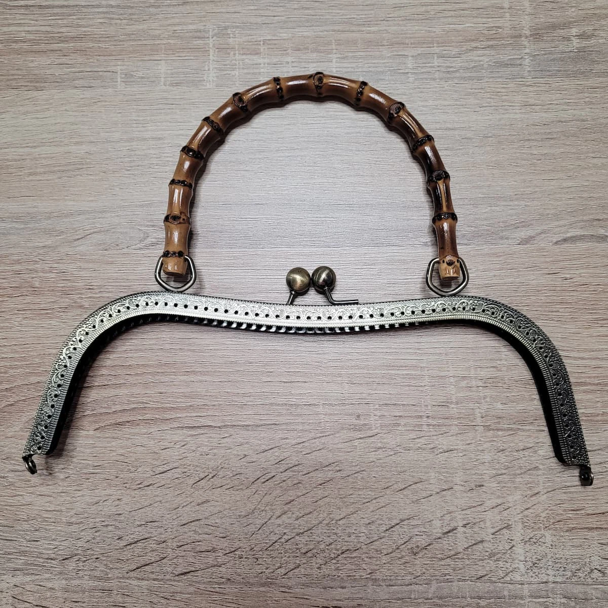 Boquillas en color bronce y con asa de bambú, de 27 cm. en su parte más ancha, la inferior. Especiales para hacer bolsos de mano o neceseres.