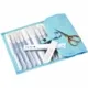 El set contiene: Ganchillos de acero con empuñadura acolchada finos (nº 0,90, 1,00, 1,25, 1,50 y 1,75 mm.), ganchillos con empuñadura acolchada (2,00, 2,20, 2,50, 3,00, 3,50 mm.), tijeras con hojas curvas, 2 agujas Tapiz, Estuche con borla
