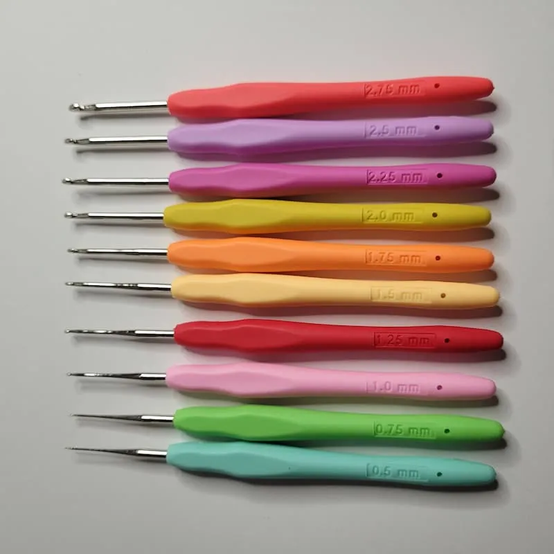 Agujas de ganchillo profesionales de 0,5 a 6 mm. con mango de plástico para mayor comodidad y numeración grabada.
