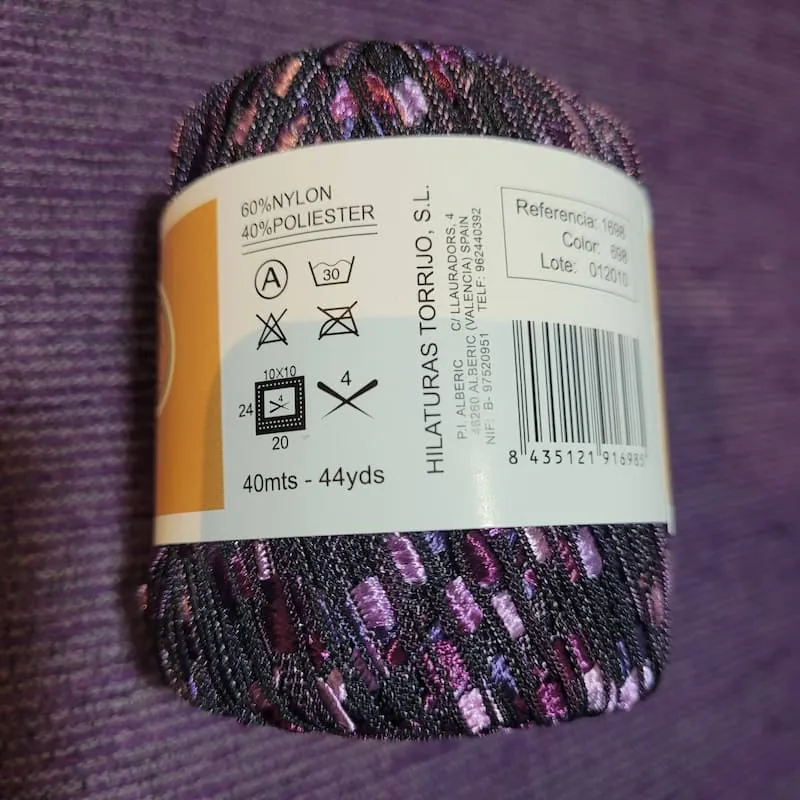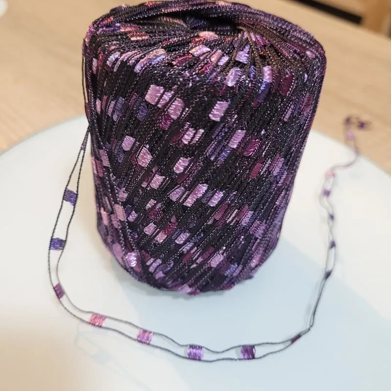 Este es un hilo de fantasía para tejer a dos agujas y dar un toque original y muy bonito a tus proyectos. Hilo negro con detalles en brillo en colores rosados y malvas.